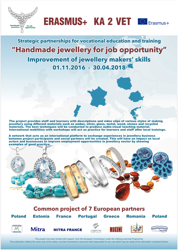 „Bijuterii lucrate manual pentru oportunități de angajare” este un proiect de parteneriat strategic Erasmus + KA 2 VET cu durata de 18 luni ce se axează pe SCHIMBUL de BUNE PRACTICI. Consorțiul ce va implementa acest proiect este o reţea de 7 instituții complementare din Estonia, Grecia, România, Portugalia, Franța și două din Polonia. Ele deţin experiență și expertiză pentru a realiza toate etapele proiectului, provenind din diferite domenii ale educației și formării profesionale.
